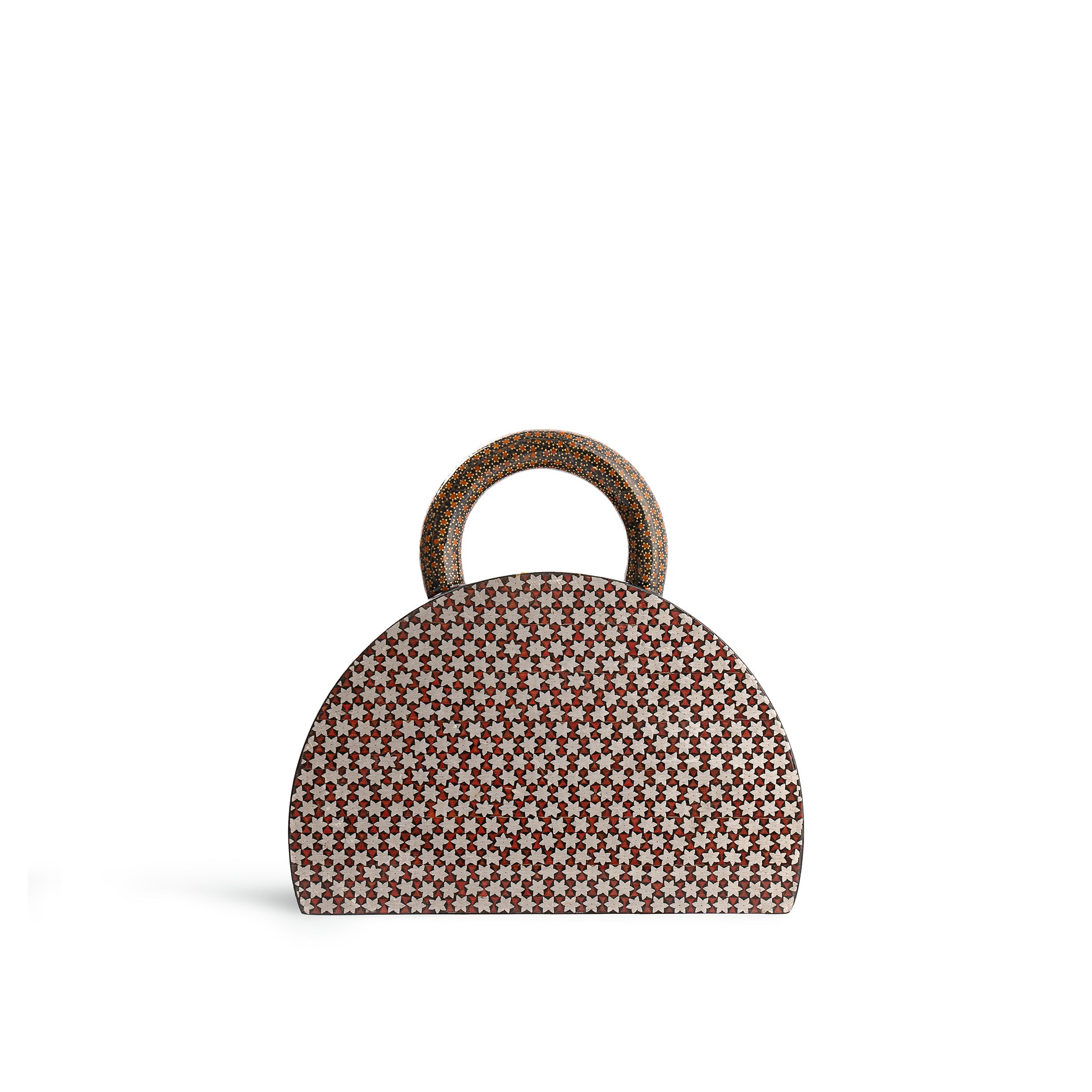 This wearable art piece is a celebration of Persian marquetry (Khatam-kari)—a 700-year-old rare craft tradition. In this extremely elaborate process, hundreds of pieces of wood, metal and camel bone are carefully crafted together per square centimeter to produce intricate designs.